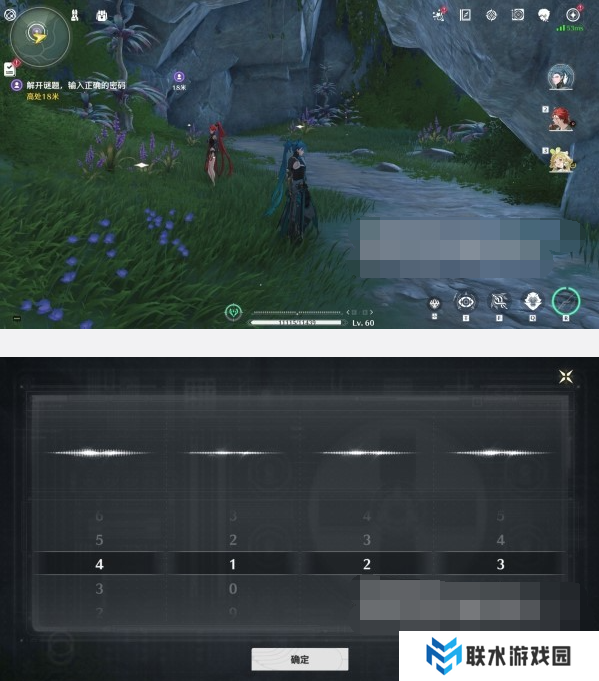 2、输入密码【4123】打开安全屋,这个密码提示为附近的紫色花朵数量,与吟霖对话可以获得提示。