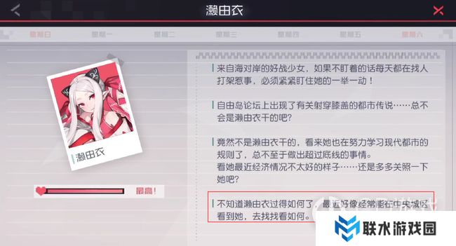 1、濑由衣手帐更新,位置也是在公园附近(这里需要将濑由衣的好感刷满才能获得新手帐)。