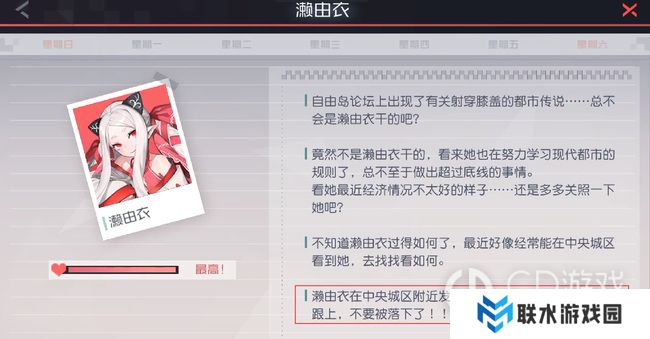 1、濑由衣手帐更新,在中央城区发现那家伙的线索,需要立刻跟上。