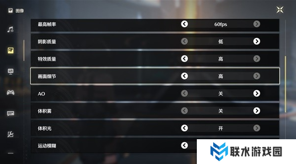 2、在设置中左侧选择第二个,然后把阴影调最低、AO(环境光)关掉、体积雾关掉;