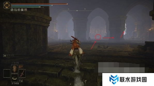 5、此处可以看到左右两边各有一个圆形建筑,我们往左侧的那一个走,中间雕像的位置可以捡到一个【灵灰】。