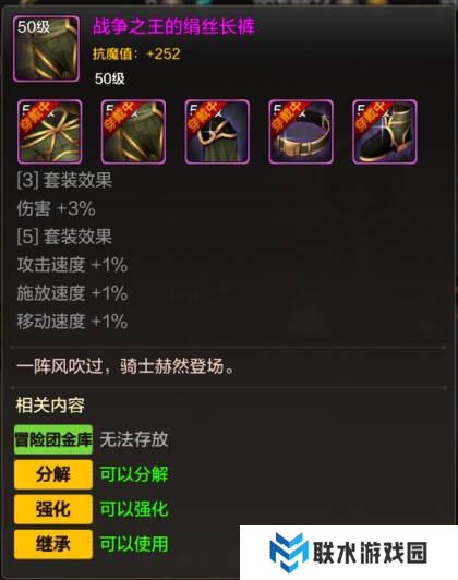 战争之王套装享有三件套和五件套效果,三件套效果为伤害增加3%,五件套效果为攻击、移动、释放速度各增加1%。