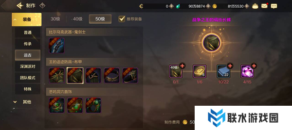 可以在打造-制作-装备-远古栏当中使用【远古王国的金币】将装备升级为50级的神器级防具【战争之王】系列装备,使其原有属性得到加强,非常适合作为勇士们的过渡装备。