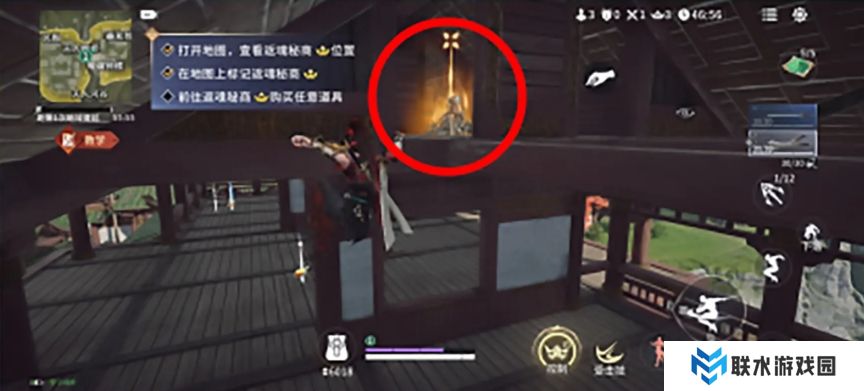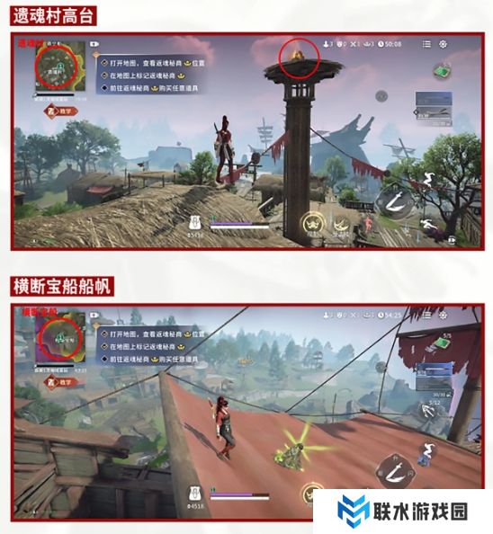 遗魂村的高台和横断宝船的船帆这里有固定金/绿堆,可以来拿一下(下图为这两个点位的实际位置)。