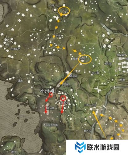 图中红色为主城搜点路线(红圈推荐落点),黄色为打野搜点路线(黄圈推荐落点),这些都是能在短时间内快速搜肥的路线,供大家参考: