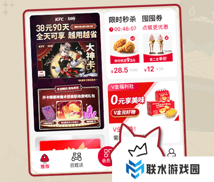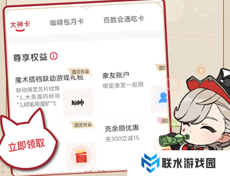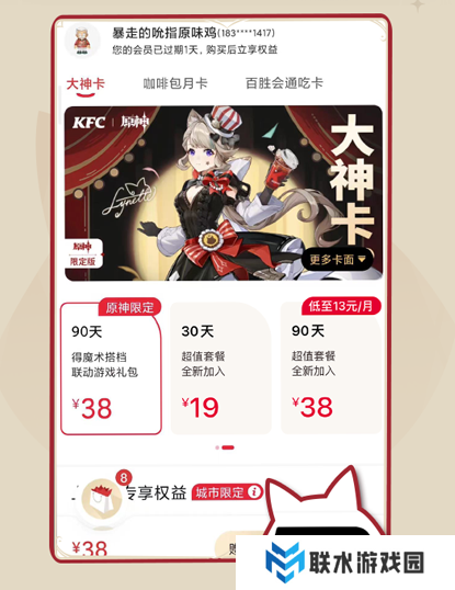 注意:购买虚拟原神联动大神卡(注意是虚拟,只有电子联动卡面,没实体卡,有林尼和琳妮特两种卡面选择),即可解锁90天肯德基优惠权益。除此之外,还会获得「原神魔术搭档联动游戏礼包」,内含游戏道具:「联动限定名片纹饰」+「大英雄的经验x3」+「精锻用魔矿x5」。