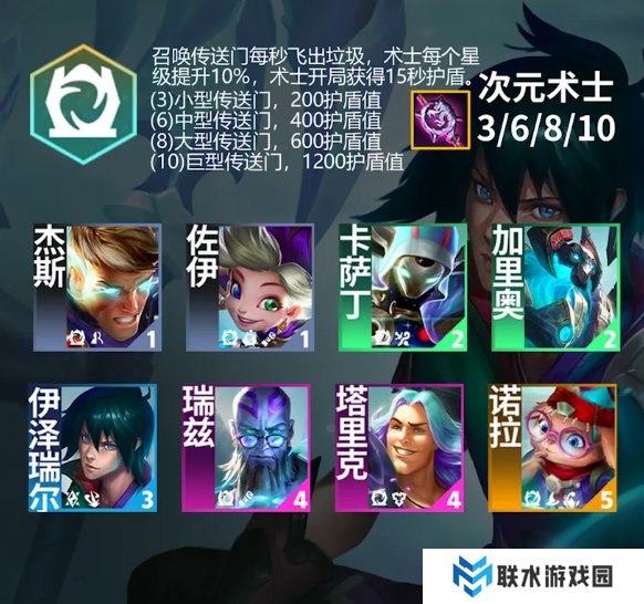 召唤传送门每秒飞出*,术士每个星级提升10%,术士开局获得15秒护盾。