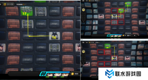 3、左右两边会出现敌人往图红色框区域扔炸弹,所以大家只需躲着红色框区域走就行,实在躲不过被炸几次也是可以的,上面会有休息区域回血,红色框区域是会不断变换的;