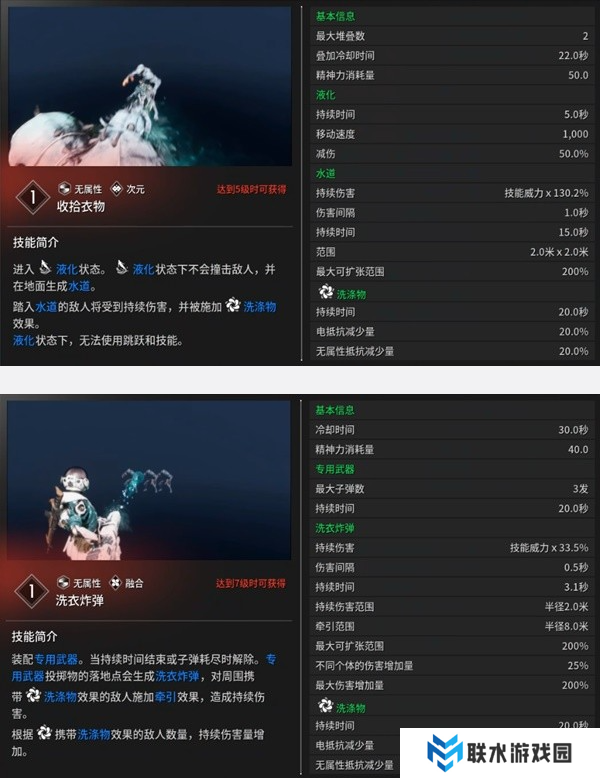 ③收拾衣物(次元):进入液化状态。在液化状态下,无法离开地面,也无法使用技能,但可穿过敌人,并使移动速度和防御力增加。在液化状态下移动时,可对敌人造成持续伤害,并生成使敌人成为洗涤物的水道。