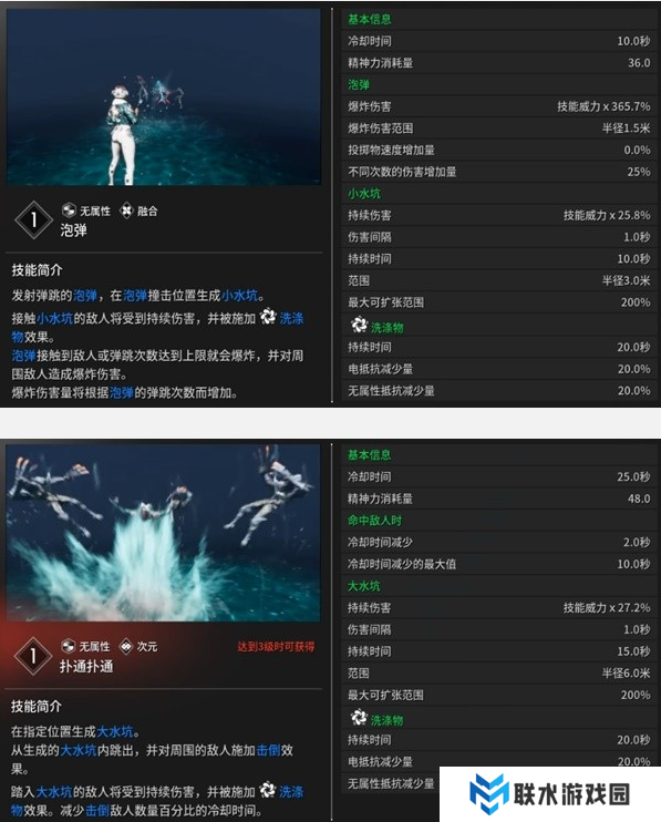①泡弹(融合):向前方发射泡弹,在弹出的位置与自己所在的位置生成一个小水坑。小水坑内的敌人将受到持续伤害,并成为洗涤物。