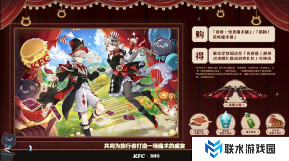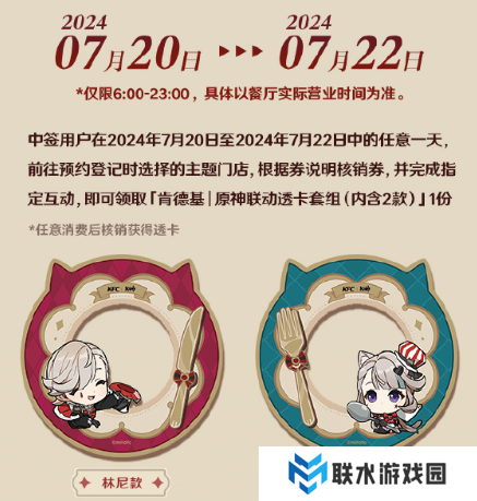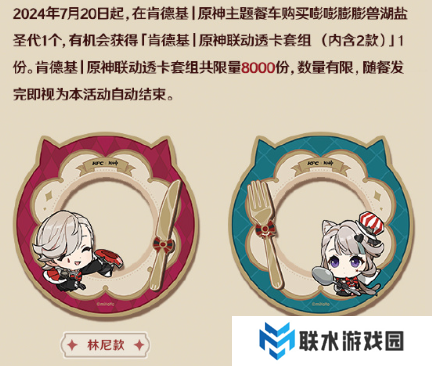 玩家只要在活动期间内购买套餐,之后前往预约登记时选择的主题门店,根据券说明核销券,并完成指定互动,即可领取「肯德基|原神联动透卡套组(内含2款)]1份(看样子要抽奖,且只能主题店参与)。