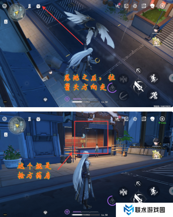 3、落地之后,往箭头方向走,然后就可以看到有【拾方药房】了。
