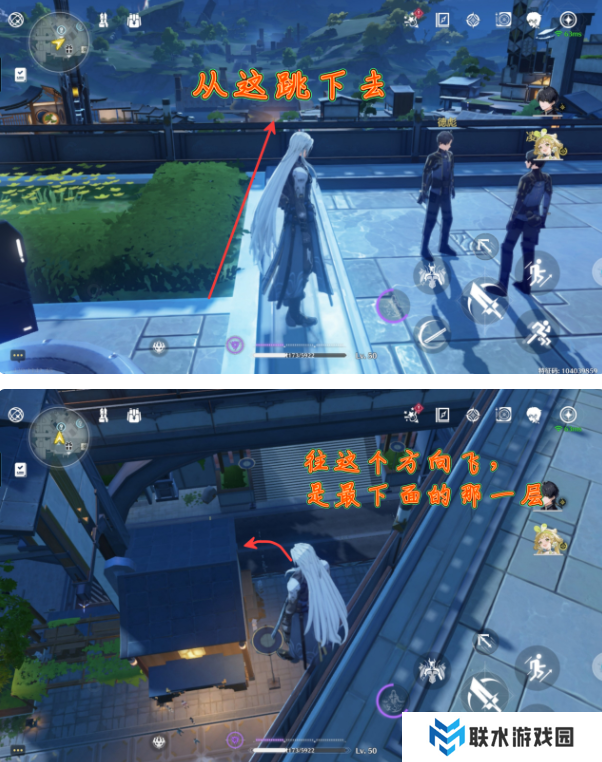 2、然后视角往左侧转,从边上跳下去,之后往这个方向飞,是到最下面的那一层;
