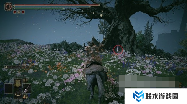 2、然后来到上图画圈的位置即可看到树旁的光点拾取获得护符【金黄色编发】。