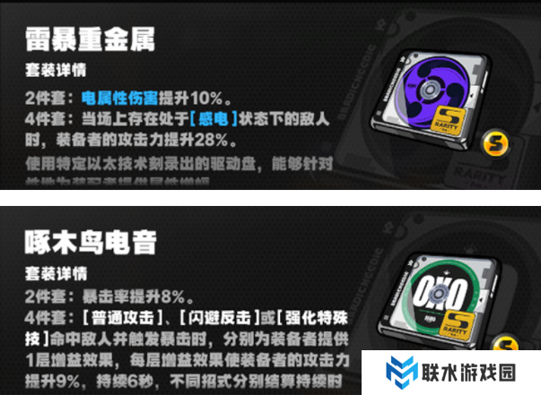 雷暴重金属+啄木鸟电音二件套(电属性伤害伤害加成,暴击率加成)