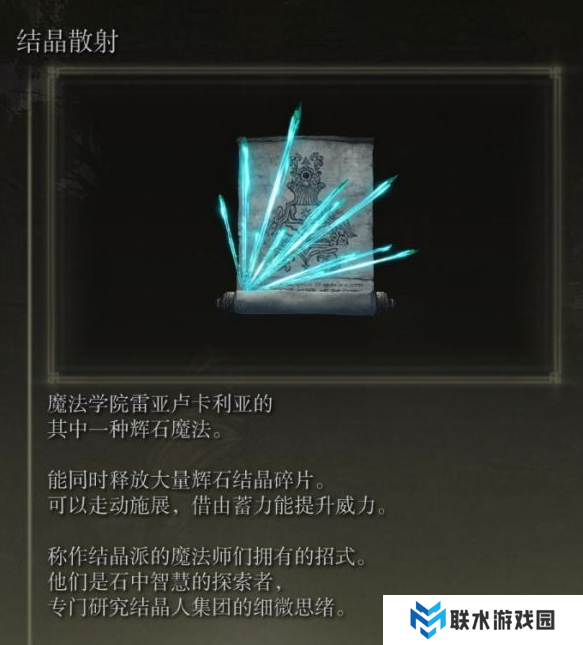艾尔登法环游戏中有很多魔法,其中“结晶散射”是回散发弹片的魔法,这个魔法的命中率稍微有点低,但是命中敌人伤害很高,那么具体怎么获得,可以参考小编接下来给大家带来的详细介绍。