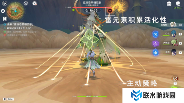 开场使用主动策略,使其瘫痪,开启爆发,以雷元素攻击为主,破坏草盾,积累活化性,等瘫痪结束后,使用主动策略,使其瘫痪,开启爆发。