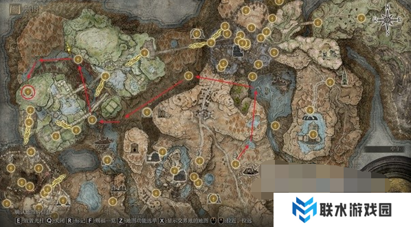 2、从赐福【穆斯废墟】出发,按照下图路线往右上角走穿过一个山洞到达山体的另一边,然后往地图左边走经过赐福【古遗迹下方】。