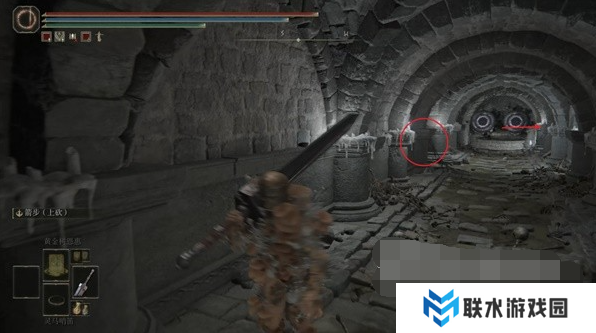 7、随后沿着路往右走,注意右侧的走廊有一个眼睛怪物,不要被攻击到,可以通过左侧空出来的位置暂时躲避,一直走到前方**雕像的位置右拐。