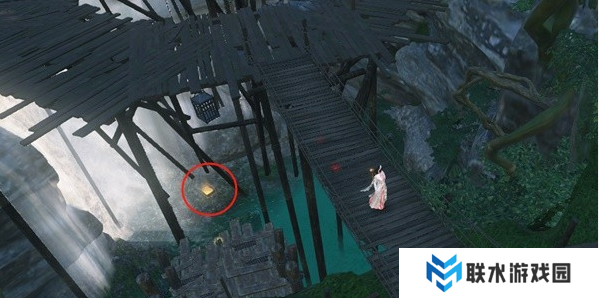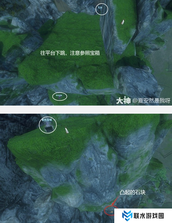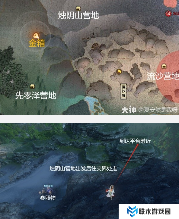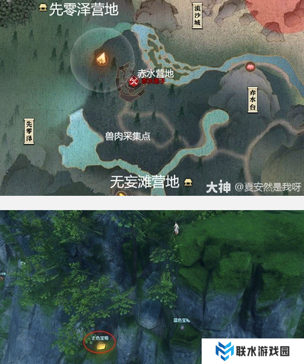 从先零泽营地出门,2点钟方向一直往前或承荒之木追风翼正前方下跳后,往左侧走
