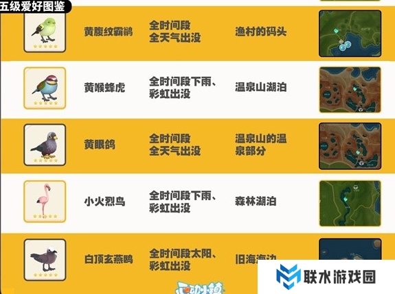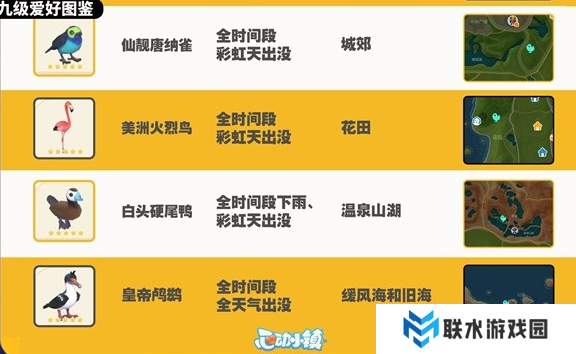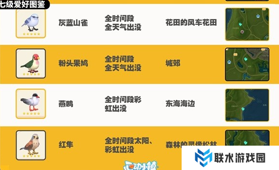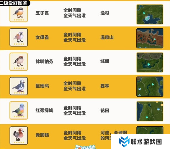 心动小镇游戏中会有观鸟的休闲玩法,玩家就是要去不同位置中来给鸟进行拍照,拍照之后就可以解锁观鸟图鉴了,那么具体的图鉴是什么,可以参考小编接下来给大家带来的详细介绍。