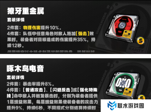 物理角色带獠牙重金属(物理套装),再加上啄木鸟电音二件套(加暴击),就很不错,二件套也可按需选择,看你需要能量,还是攻击,还是暴击暴伤。