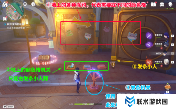 1、可以看到墙上的涂鸦颜色从左到右为“绿、蓝、红、蓝”,玩家需要让发条小人按照这个顺序去踩颜色格;