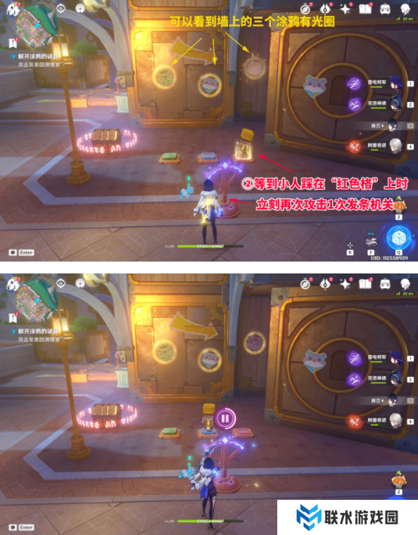 4、第三步:此时墙上4个涂鸦全部由光圈,代表谜题成功。