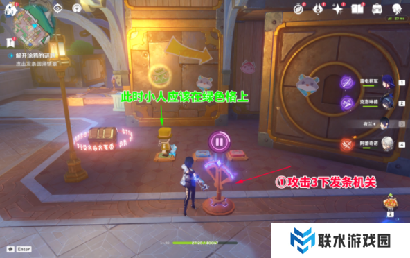 2、第一步:攻击3下发条机关,让发条小人踩在“绿色格”上;