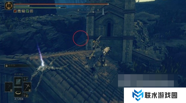 5、在教区开始跳房子,先沿着下图所示路线跳到前方左侧的房顶上。