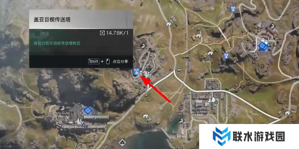 1、玩家来到【盖亚巨楔】的传送塔来位置,点位如下图: