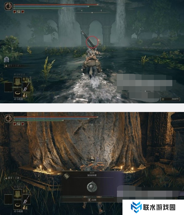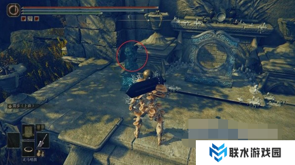 4、此时往左前方走不了多远就能到达尽头的雕像位置,拾取雕像前的光点获得护符【铜绿圆碟】。