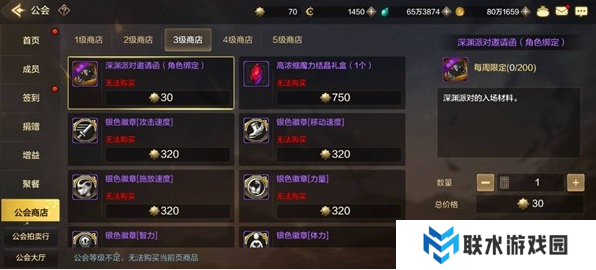 公会等级达到3级的时候,每日可以使用贡献币兑换深渊派对邀请函,30贡献币可以兑换一个,每周限定兑换200个。