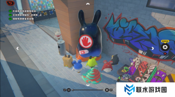 5、然后再来合影训练,进入到合影界面之后呢,这边我们视角要往左下方拽,这边要拍到左侧这个白色邦布的全身,然后还要把其他的几只邦布都要拍到。当右侧出现发现目标的时候拍照即可完成。