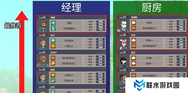 大堂要满足清理>鸡尾酒=饮料≥芥末,四个技能都要有。经理锁死德瑞的情况下,由于他的清理高优先度+855高服务,个人认为不用补清理人员。那么补一个饮料一个芥末。