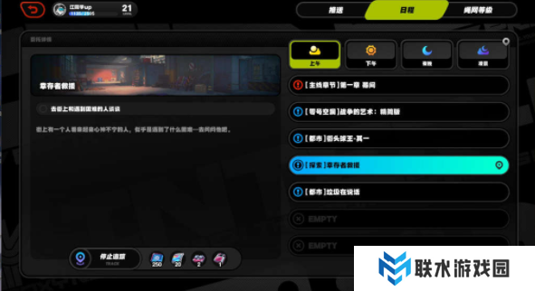 2、该【探索委托】需要在游戏上午才可以开始做,可以通过调节系统时间【休息一会】(现实1天只能调节1次),或者沙发上休息,或者去打【空洞深潜系统】【战斗委托】物流事故(这个比较好打点),3种方式调节系统时间;