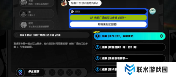 跟随任务指引,在江边找到莱卡恩,和他一起散散步吧。(此处选项随意)莱卡恩的毛发被吹乱了,此时选择“我帮你整理吧!”,好感度提升!(难道狼哥喜欢摸摸毛!?),结束对话还会大幅度提升好感度!