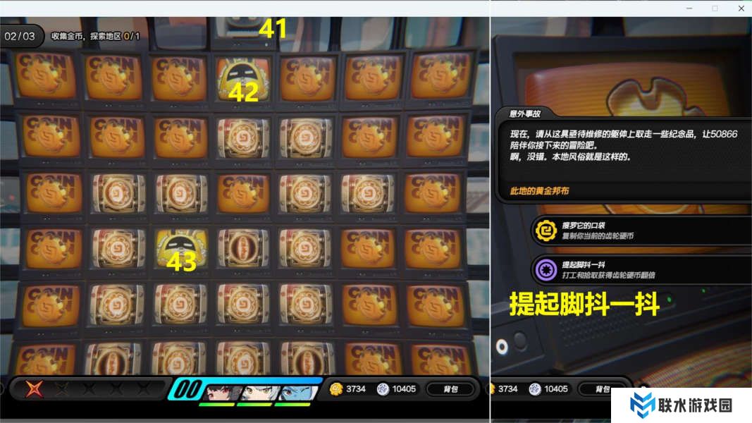 15、接着先去将42和43区域的黄金邦布抓到后选择【提起脚抖一抖】,再将其他齿轮硬币和门全部收集了,然后继续去下面;