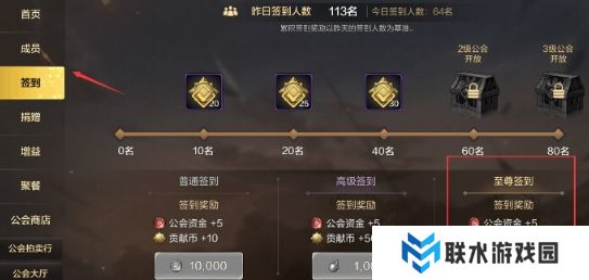找到左边“签到”功能,可以选择消耗特定资源进行一次签到,推荐优先使用泰拉进行签到,可以获得更多贡献币。