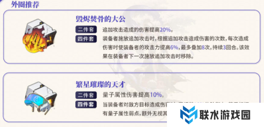 其次外圈还可选择【量子套】,二件套的量子增益以及四件套的无视减防,均是翡翠所需求的属性,只要敌方有量子弱点就能吃满增益,若队伍中减防没有溢出时,此遗器套装是一个不错的选择。
