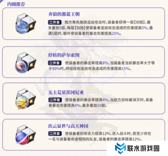 【停转套】也是一个非常不错的选择,在提高一定暴击率的同时,暴击率超过50%,还能为终结技与追加攻击增伤。
