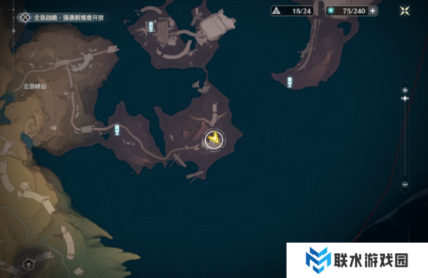 1、在北洛峡谷的位置有一个解谜宝箱,位置如下图:
