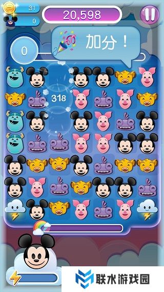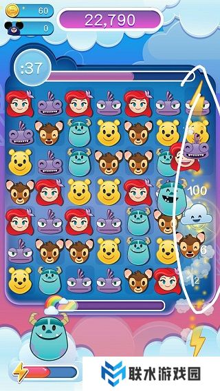 2、游戏开始滑动屏幕,让三个相同的表情相连即可消除得分,若能集齐四个相同的表情,将生成一道闪电云,它能助你消除整行表情。