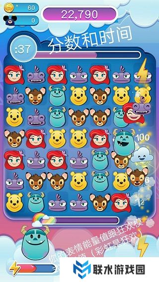 4、在游戏界面的上方,可以实时看到你的分数和剩余时间,右下角的键盘里,藏着你的表情人物符号,当能量值满时点击即可释放特殊技能,让你更轻松地消除表情。