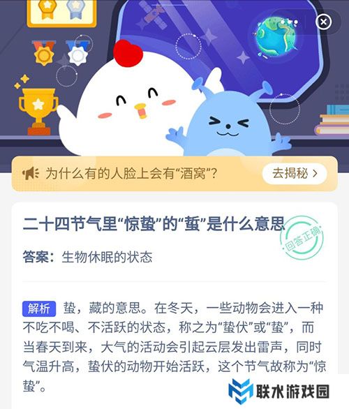 关于二十四节气惊蛰中的蛰是什么意思呢,正巧今天就是惊蛰,小鸡宝宝考考你蚂蚁庄园中的问题就是这个,如果小伙伴们答对,今天的小鸡饲料就可以轻松领取,赶紧一起看看正确答案是什么吧。