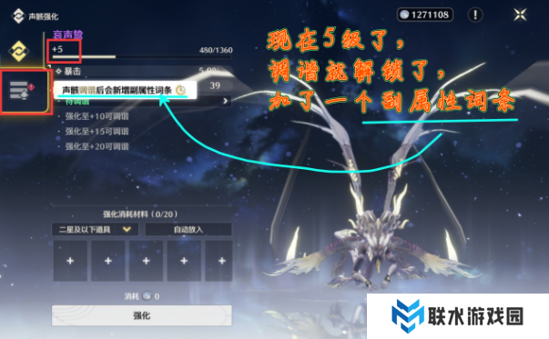 打开角**面,选择【声骸】系统,点击任意一个声骸,强化到5级后,就可以解锁新的词条了,这个就是声骸调谐了,最高强化到20级,一共可以解锁四个新的属性词条。