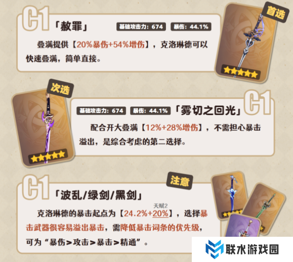 克洛琳德的暴击起点为【24.2%+20%】,选择暴击武器很容易溢出暴击,需降低暴击词条的优先级,可为“暴伤>攻击>暴击≥精通”。