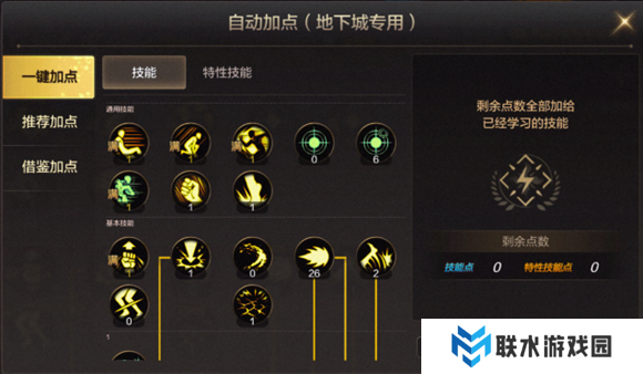 仅供前期PVE刷图使用,PVP对战因人而异,视自身玩法而定,懒人党可以直接使用游戏内的【一键加点】功能,后续根据自身习惯再调整。