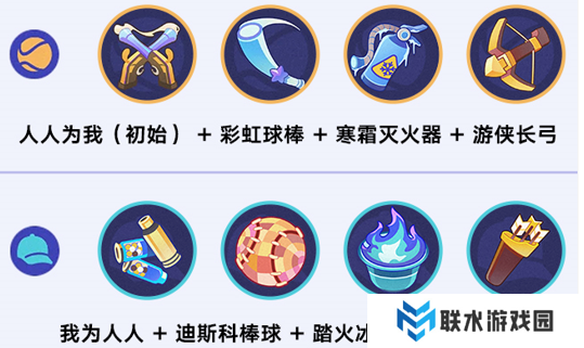 武器组合:人人为我(初始)+彩虹球棒+寒霜灭火器+游侠长弓