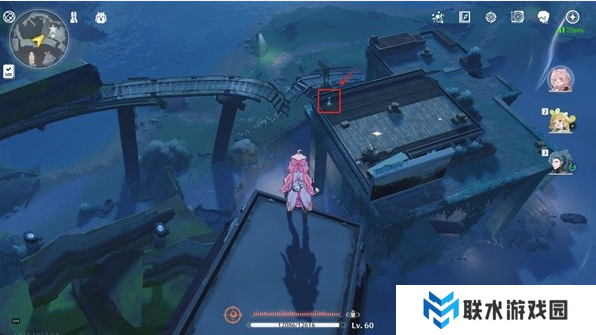 观景点位于焚焰海右边的桥上,我们从如图角色所在位置的传送点绕到桥底斜坡上去即可。